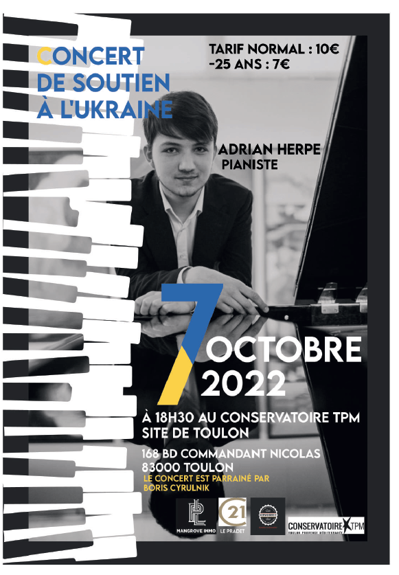 Un récital de piano avec Adrian Herpe, jeune pianiste franco-ukrainien, se tiendra le vendredi 7 octobre à 18h30 à l’auditorium du Conservatoire de Toulon.