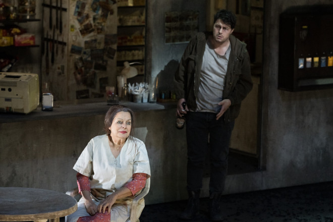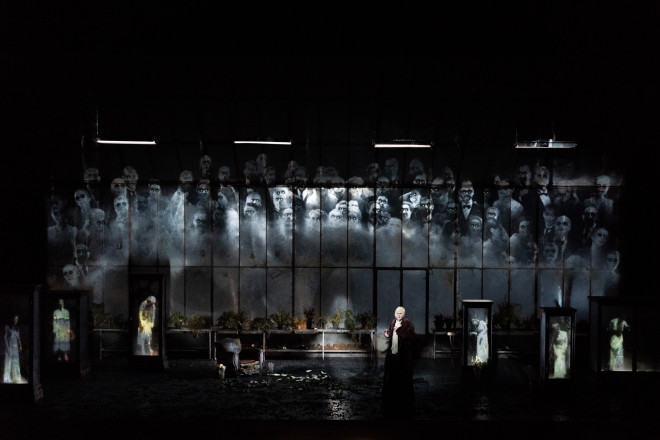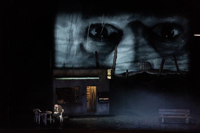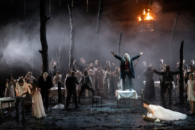Le metteur en scène David Bösch revient à Lyon où il mettait en scène Les Stigmatisés du même Schreker en 2015. La dramaturge Janine Ortiz, spécialiste de Schreker et également écrivaine de littérature d’horreur, inspire ici l’univers sombre et terrible du décor principal, imaginé par Falko Herold : la forêt encore fumante ne semble pas remise de ses incendies réguliers. L’auberge de la vieille Lola est une misérable épicerie avec vue sur le château d’Irrelohe, silhouette mystérieuse et lointaine surplombant le village. Tandis que les habitants semblent résignés à leur misère, notamment traduite dans leurs costumes signés Moana Stemberger, les gens du château sont comme des revenants, encore plus blafards que les gens d’en bas. Si les lumières de Michael Bauer sont souvent froides, avec des jeux subtils d’ombres, elles profitent des épisodes annonçant le grand incendie pour se réchauffer avec douceur, menant vers un effet de contraste saisissant. La vidéo également utilisée dans la mise en scène apporte en compléments de l’action les visions des personnages grâce à des courts-métrages en noir et blanc (comme des films des années 20-30). Projetant quelques images poétiques et heureuses, mais mettant particulièrement en valeur les regards, elles permettent d’en comprendre davantage sur la psychologie des personnages, leur folie surtout, l’action aussi qu’elle ne court-circuite jamais.