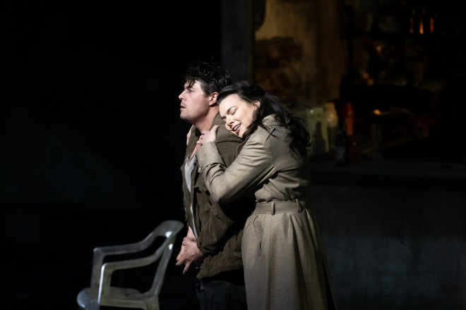 La fosse souligne aussi les rapprochements musicaux entre la partition de Schreker et l’esthétique de son contemporain Richard Strauss. Or, les deux compositeurs demandent également des voix tout aussi vaillantes et puissantes, vocalement et dramatiquement. La soprano canadienne Ambur Braid offre ainsi au personnage d’Eva sa présence vive et intense. La projection équilibrée déploie son timbre moelleux. Le chant vibrant est toujours compréhensible, et l’investissement constant (avec un sommet particulièrement terrifié face à la folie et à la violence grandissante de Peter). Celui-ci, incarné par le baryton allemand Julian Orlishausen, se montre d’abord un peu gauche, mais cela convient au personnage et lui permet de gagner en assurance pour représenter combien il perd la maîtrise de lui-même (l’un de ces terribles paradoxes qui font la flamme de ce drame et du jeu d’acteur). Son timbre bénéficie aussi d’une touchante candeur, ses phrasés sont nuancés mais son souffle sollicité jusqu’à ses limites l’empêche de toujours donner véritablement corps à sa voix (hormis dans la jalousie démente de son duo avec Eva).