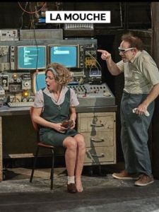 Les deux complices se réapproprient cette histoire de fusion génétique entre humain et insecte. Ils installent les personnages de La Mouche dans un village de la France profonde. C’est là que Robert, un quinquagénaire vivant avec sa mère Odette, passe son temps à tenter de mettre au point la fameuse machine … Travail corporel, effets spéciaux, esthétique des prémices de l’informatique : La Mouche est un véritable laboratoire d’expérimentations scéniques, un extraordinaire terrain de jeu.