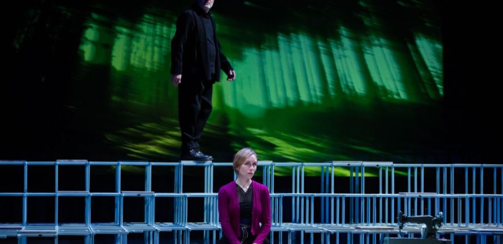 Dans une scénographie éclatée, voie ferrée de rondins de bois tout le long de l’avant-scène, photos de forêt ou de train en arrière-plan, suggestives et panoramiques, les comédiens dialoguent à travers une énigmatique structure composée de formes rectangulaires, sur laquelle ils tiennent en équilibre précaire jusqu’à la dernière scène nimbée d’une douce lumière diffuse d’une grande suggestivité.