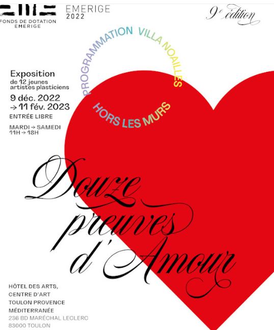 La Métropole TPM, en partenariat avec la villa Noailles, invite jeudi 8 décembre à 18h au vernissage de l’exposition « Douze preuves d’amour » Hôtel des Arts TPM 236, boulevard Maréchal Leclerc 83000 Toulon. Cette expo invitée a été déjà présentée avec succès au 190 Lecourbe, dans le 15e arrondissement parisien en automne. Il ne faut pas la manquer lors de son passage à Toulon à partir de 9 décembre Entrée libre. 04 94 93 37 90.