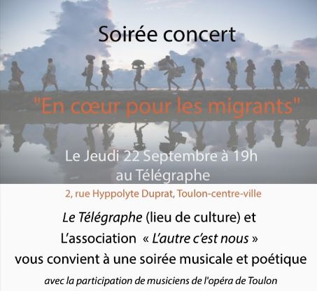 Grâce à l’initiative de citoyens toulonnais engagés, l’accueil du Télégraphe et la participation de musiciens de l’Opéra de Toulon, une soirée-concert au profit des personnes en situation de migration arrivés à Toulon est proposée le  jeudi 22 septembre à 19h au Télégraphe, 2 rue Hippolyte Duprat.