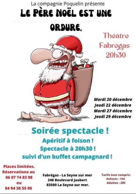 Date des représentations : 20, 22, 27,29 décembre 20h 30 Théâtre de Fabrégas La Seyne sur Mer 248 boulevard Jaubert. Apéritif et Buffet après le spectacle. Réservations recommandées :