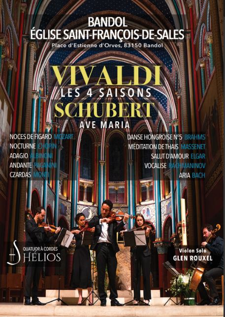 Dans ce lieu à l’acoustique impeccable le programme sera complété par des morceaux célèbres du répertoire classique : ouverture des Noces de Figaro de Mozart, Aria de Bach, Danse hongroise de Brahms, Ave Maria de Schubert, Adagio d’Albinoni, Méditation de Thaïs de Massenet, violon solo Glen Rouxel.